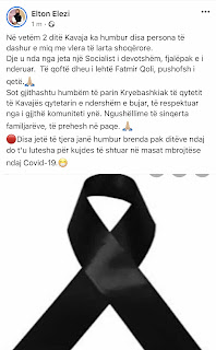 Kryetari i Partisë Socialiste të Kavajës Elton Elezi i ka shprehur ngushëllimet më të sinqerta familjarëve dhe miqve të viktimave të Covid19 në qytet ndërsa ka apeluar për më shumë kujdes në mënyrë që të mos ndjejmë dhimbje të tilla.